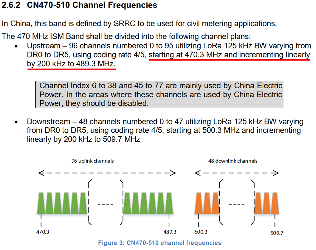 In the LoRaWAN protocol, the uplink and downlink frequencies of each band are defined in detail. These frequencies used are called channels. For reference, we have intercepted the description of the CN470-510 channel definition in the protocol document.
