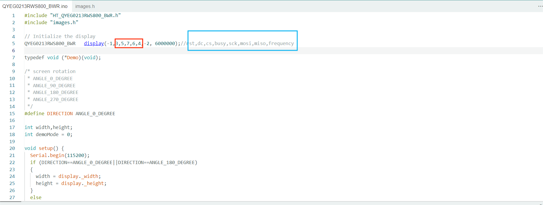 - According to the prompts of the blue box, fill in the pins connected on the development board in the red box section. 'rst' and 'MISO' will not be used in this example, set these two pins to '-1' and '-2'.
