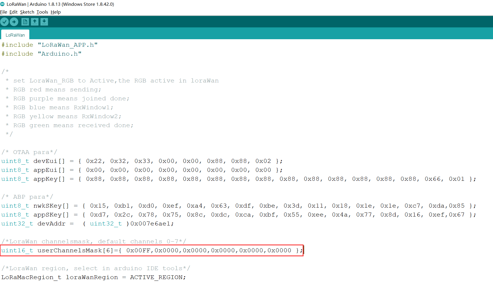 Here are 6 arrays defined all channels of LoRaWAN protocol for AU915. In the userChannelsMask[0], 0x00FF means use the first 0-7 channels, they are 915.2MHz, 915.4MHz, 915.6MHz … 916.6MHz. When you set the value to 0xFF00, it means the upload channels changed to 8-15, they are 916.8MHz, 917.0MHz … 918.2MHz. More detail... see the below picture: