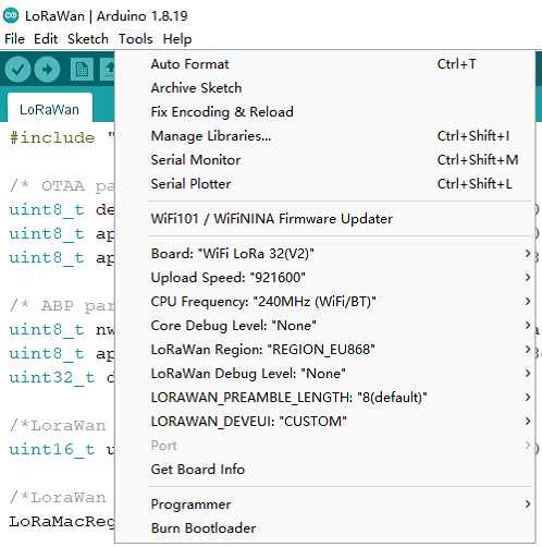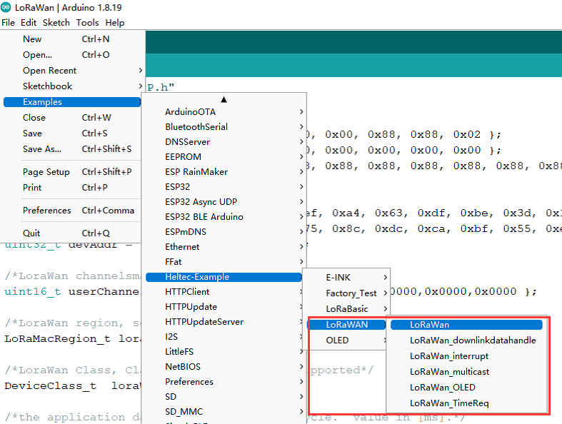Let's take File -- Examples -- Heltec-Example -- LoRaWAN -- LoRaWAN