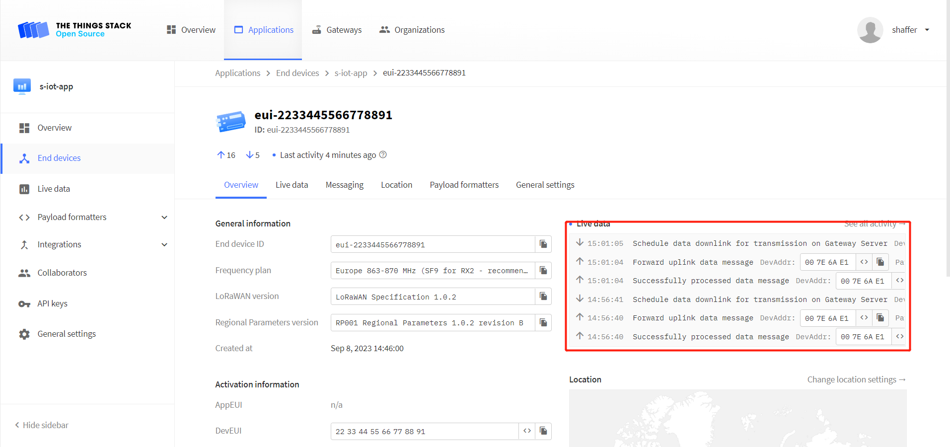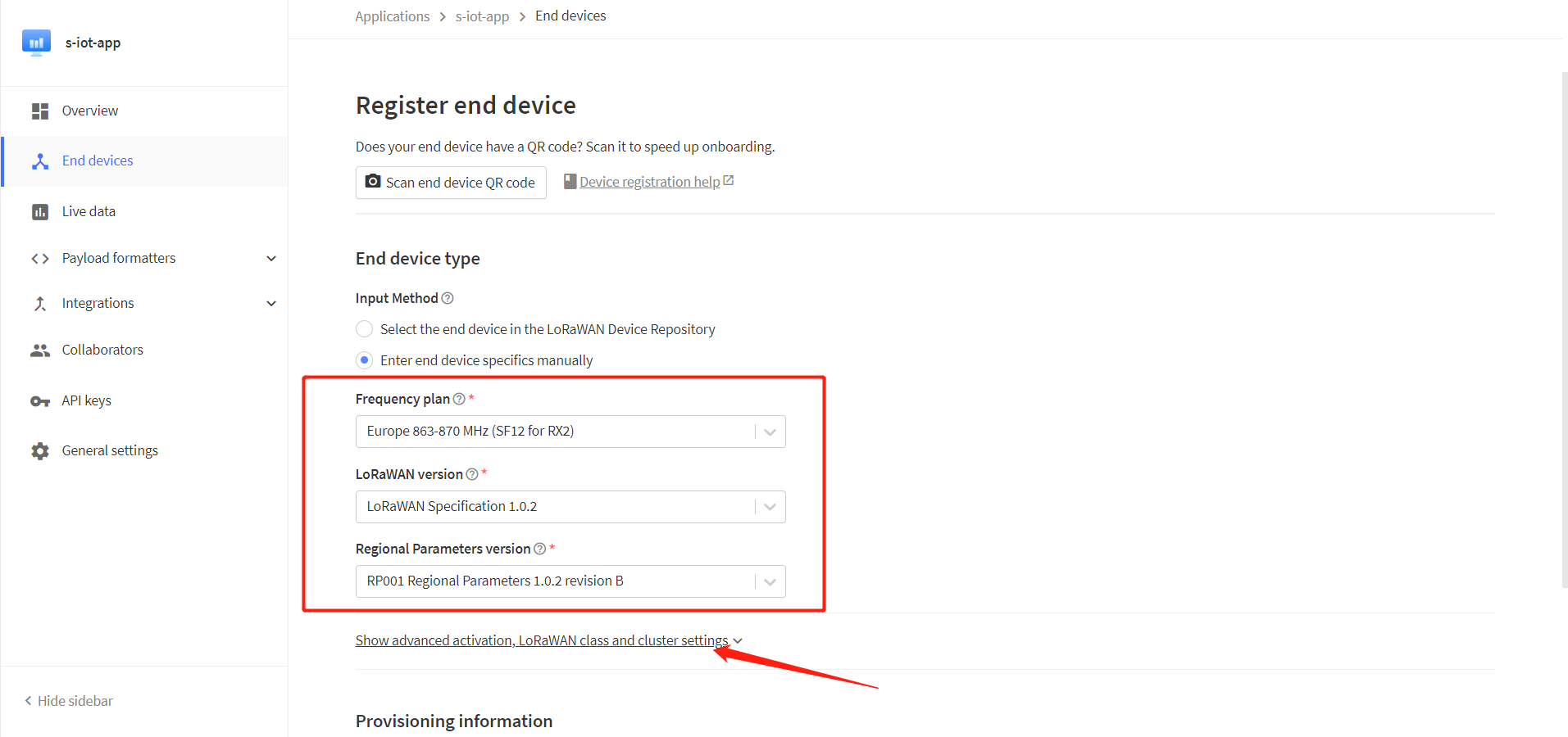 Register a new device in TTN or TTS “Applications” page. Select the frequency plan and LoRaWAN version.At this point, click the location shown in the image below