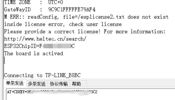 Open the serial port corresponding to the HT-M00, and send the command "AT+CDKEY=xxxxxxxxxxxxxxxxxxxxxxxxxxxxxxxx" through the serial port to activate the gateway. Among them, "xxxxxxxxxxxxxxxxxxxxxxxxxxxxxxxx" is the 32-bit license. For example, if the license is 0x12345678, 0x12345678, 0x12345678, 0x12345678, the activation command is AT+CDKEY=12345678123456781234567812345678.
