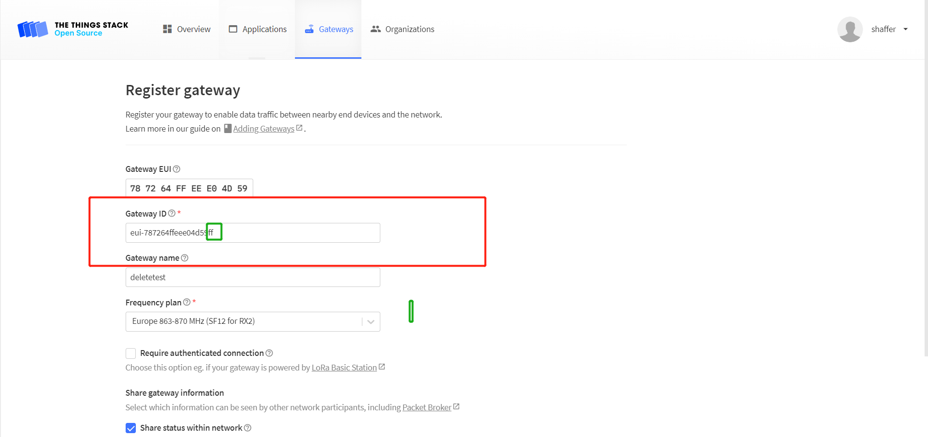 Register the gateway normally. Do not submit the information after filling in the information. At this time, the server automatically generates an ID, as shown in the red box in the following figure. Add a suffix to the ID, such as "ff", and the ID will be registered.