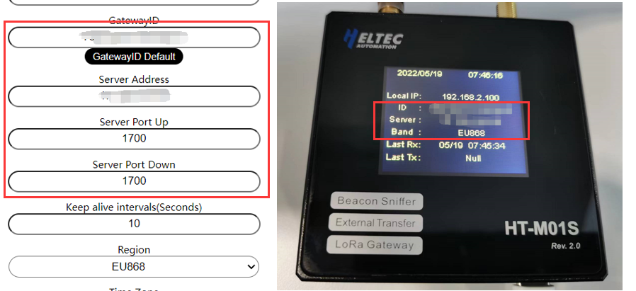 - Gateway EUI -- The unique ID of HT-M01S gateway, view from the display screen of the HT-M01S or view through the serial port (the gateway ID will be printed through the serial port when the HT-M01S starts).