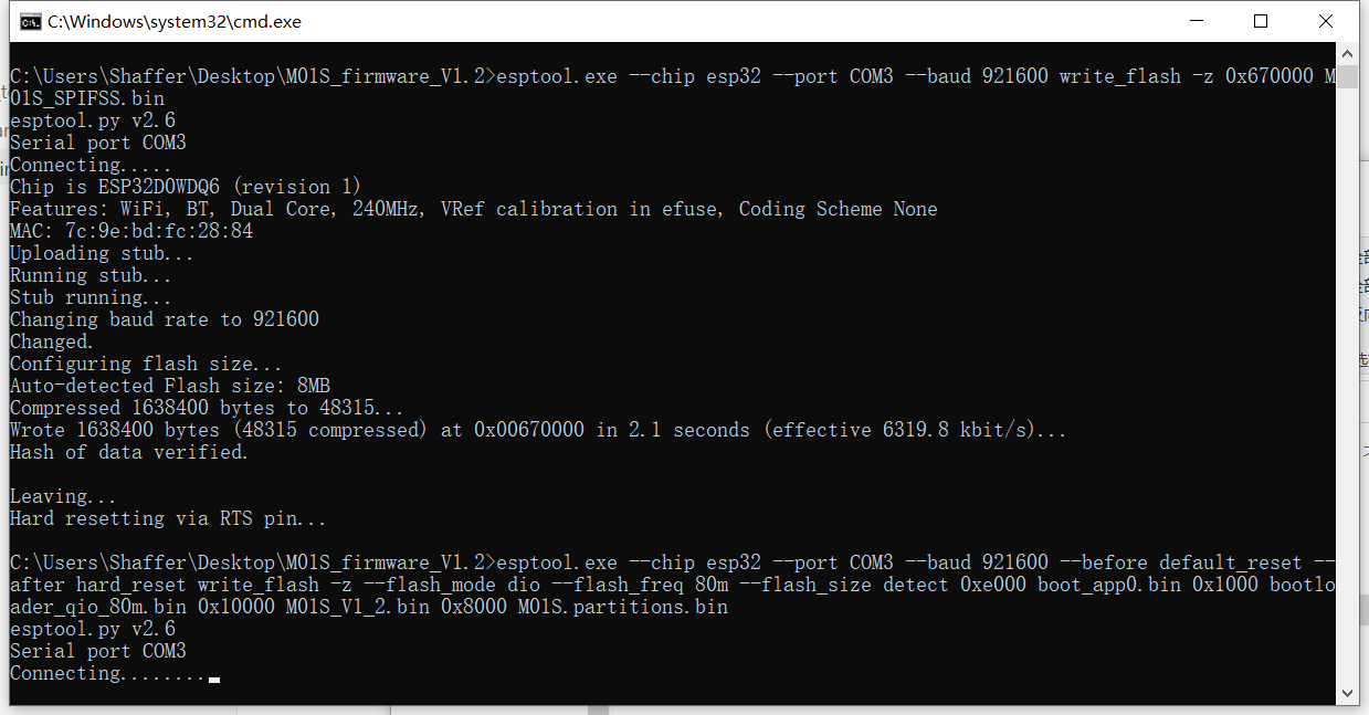 Double-click to run "M01S_Vx_x.bat". When running to the interface shown in the figure below, perform the following operations, press "+" key -> press "RST" key -> release "RST" key -> release "+" key. After the window closes automatically, the firmware programming is complete.