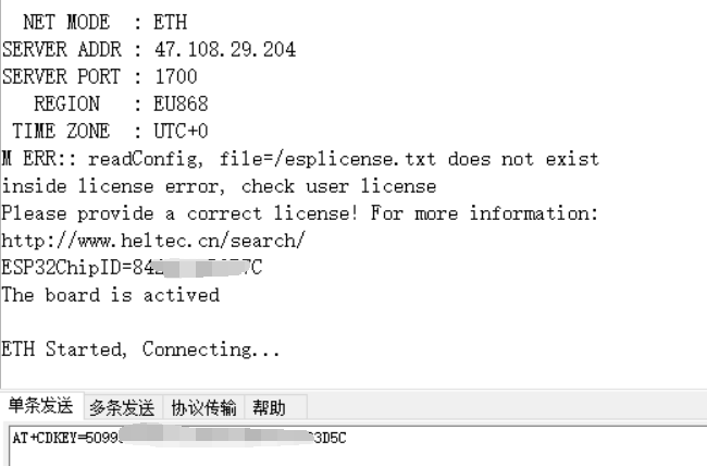 Open the serial port corresponding to the HT-M01S (Rev. 2.0), and send the command "AT+CDKEY=xxxxxxxxxxxxxxxxxxxxxxxxxxxxxxxx" through the serial port to activate the gateway. Among them, "xxxxxxxxxxxxxxxxxxxxxxxxxxxxxxxx" is the 32-bit license. For example, if the license is 0x12345678, 0x12345678, 0x12345678, 0x12345678, the activation command is AT+CDKEY=12345678123456781234567812345678