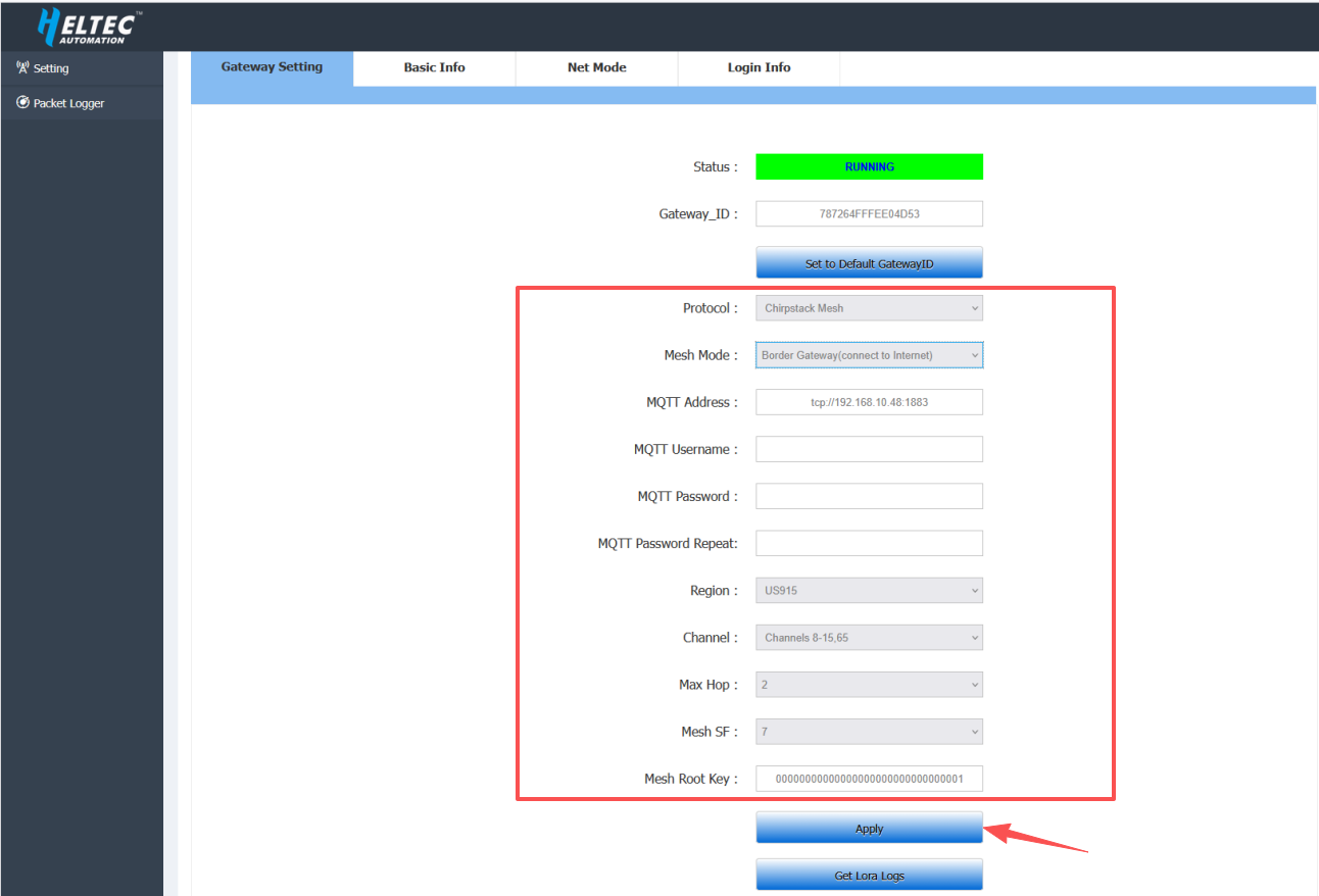 For example, if the ChirpStack server address is 192.168.10.49, then the MQTT Address should be set to: tcp://192.168.10.48:1883.