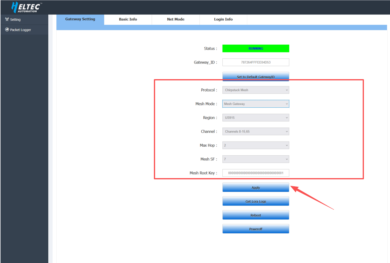 - Mesh Root Key: Enter a 32-character HEX value (network encryption key; must be identical to the Mesh Gateway)