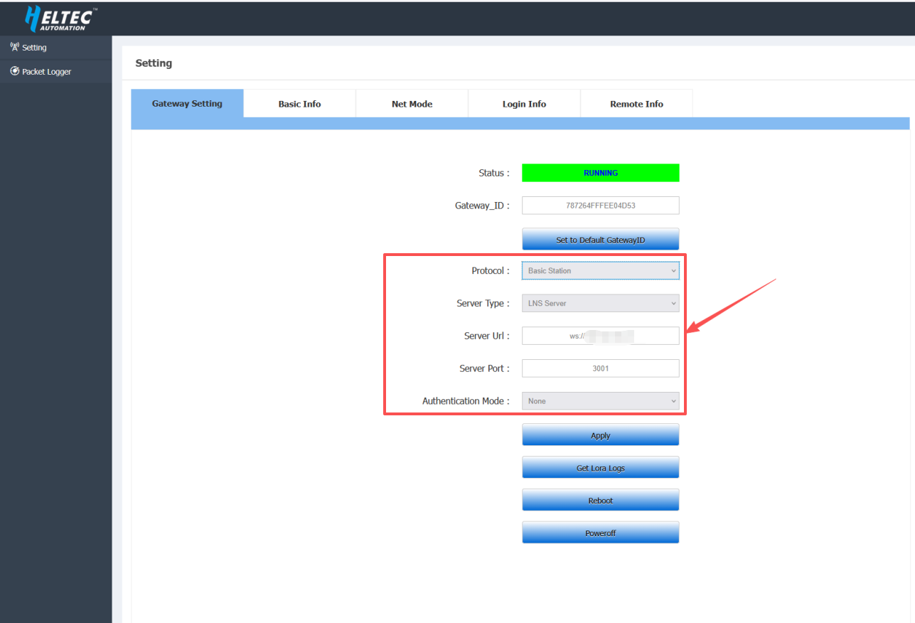 xxx.xxx.x.xxx is the ChirpStack server address. For example, if the ChirpStack server address is 192.168.10.49, then the Server Url should be set to: ws://192.168.10.48.