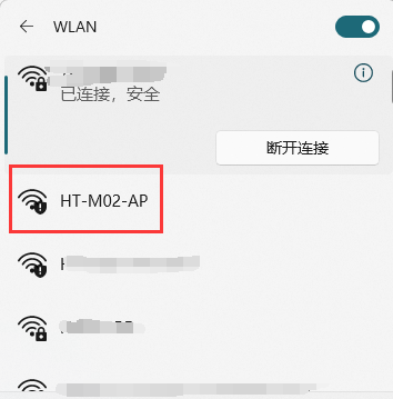Connect the antenna to the gateway, and then connect the gateway power supply. After the gateway is started, WIFI will enter AP mode, find the WIFI named "HT-M02-AP" and connect to this WIFI.