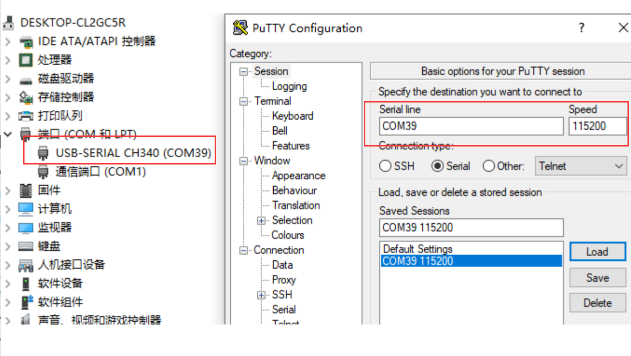 Select an appropriate serial port debugging tool. Recommended to use Putty. Select the port corresponding to the UART-USB bridge. The default baud rate is 115200. You can refer to the following configuration.