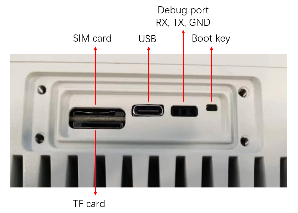 - Debug port -- UART debugging serial port. Used to view the system log. UART pins are RX, TX, GND from left to right