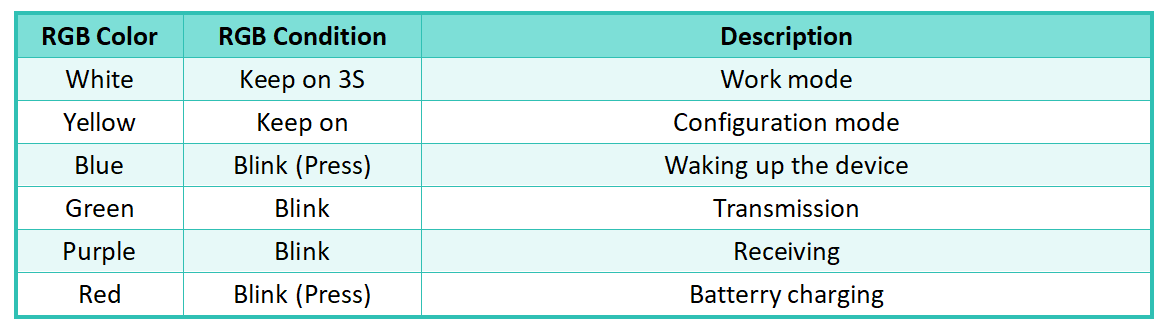 Press the button for 3 seconds. When the button shows white light, release the button. At this time, the device enters the working state, where the sending is green light and the receiving is purple light.