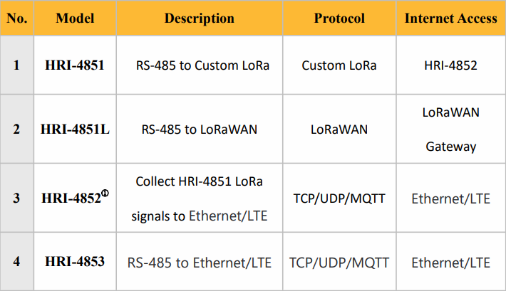 The HRI-485x series is a DTU device that converts the RS-485 bus to wireless data. Sub models achieve RS-485 data to LTE (Cat. 1/Cat. 4), private LoRa, standardLoRaWAN, Ethernet, etc. communications method.
