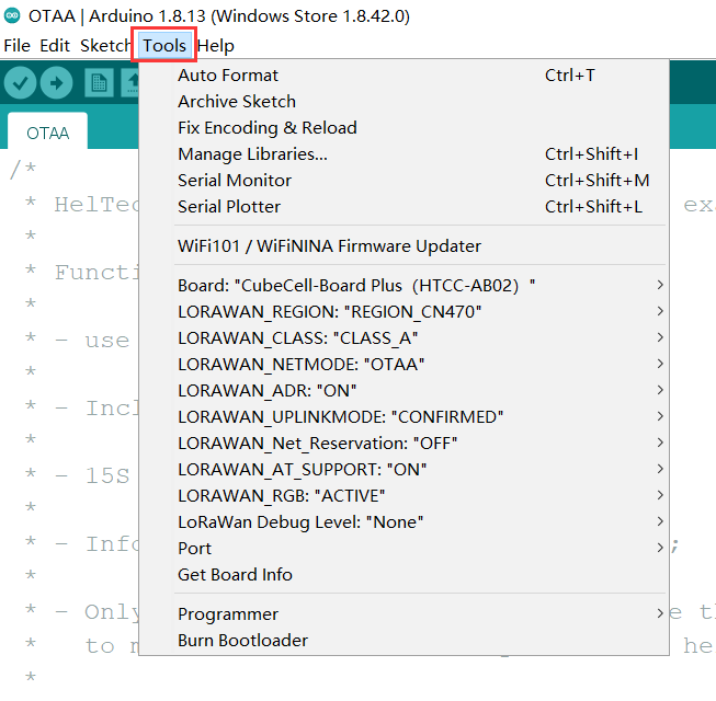 notethe tools menu must matching with the configration in LoRa server. For example, if CubeCell use OTAA, the LoRa server must enable OTAA for relevant device.