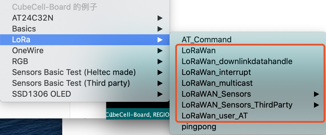 In the "LoRa" path, all examples named with "LoRaWAN_xxx" format are the examples with LoRaWAN protocol, choose one of them.