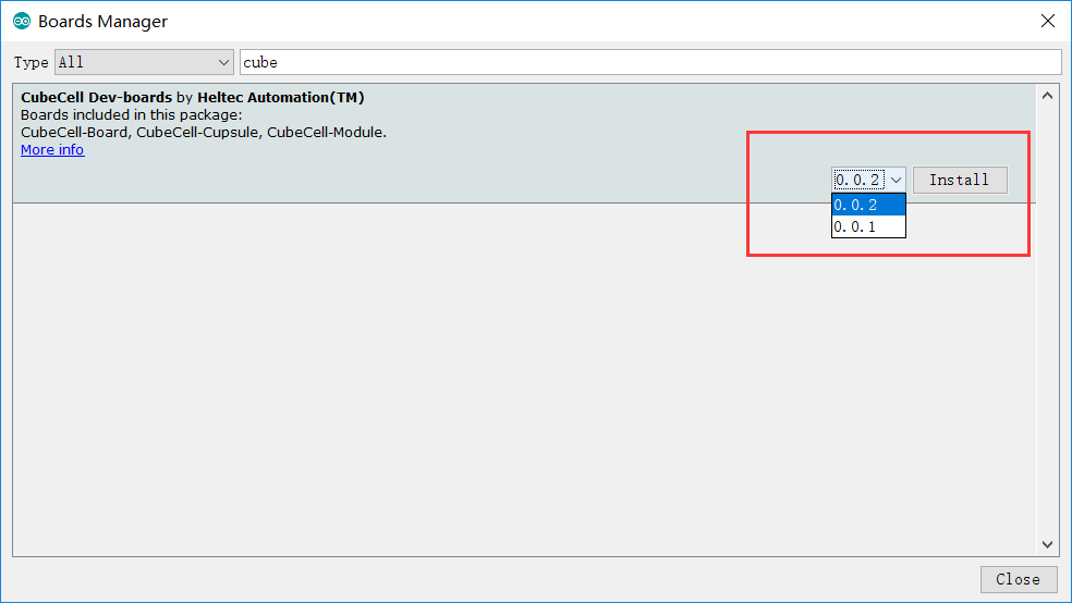 - Click Tools -> Board -> Boards Manager...`, search Heltec cubecell in the new pop-up dialog, select the latest releases and click INSTALL.