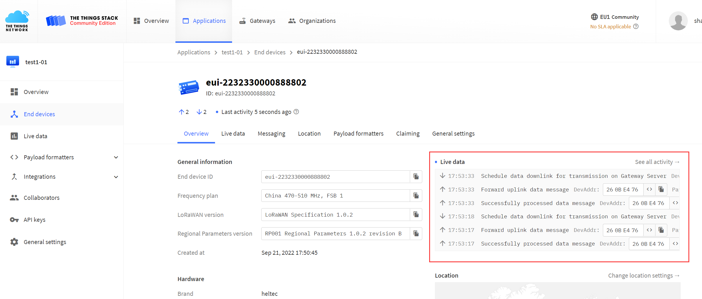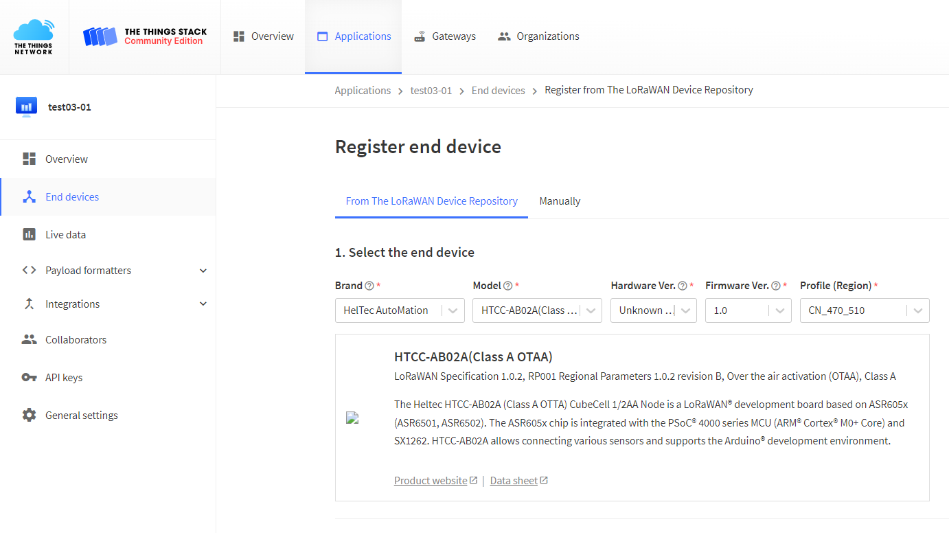 Register a new device in TTN or TTS “Applications” page. Select the corresponding Brand, Model, Hardware Version, Firmware Version, Region.