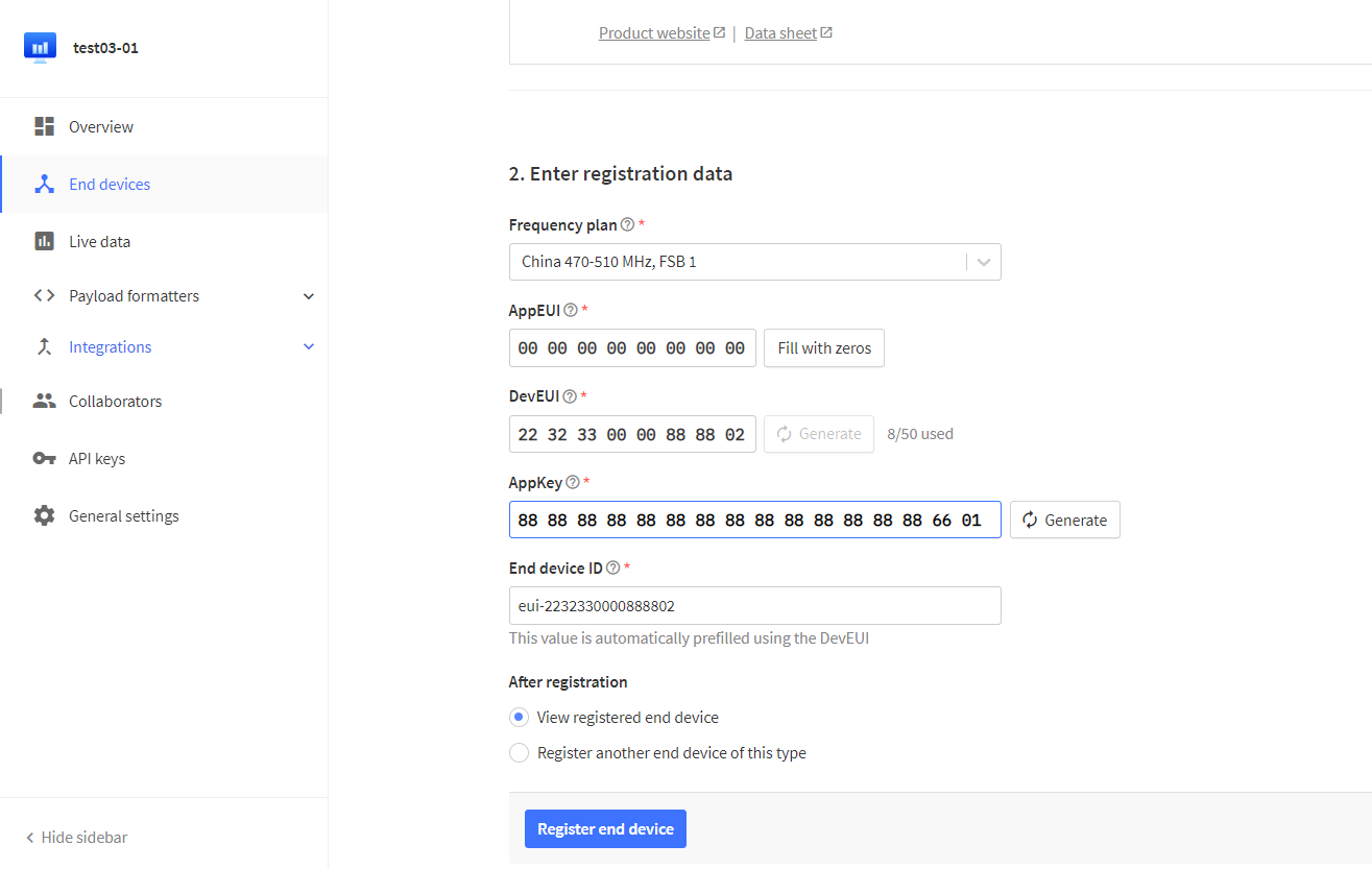 Select the frequency plan, and fill in the corresponding AppEUI, DevEUi, AppKey, and register the device.