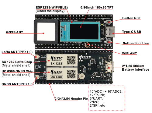 - ESP32-S3FN8+SX1262+UC6580 Chipset, supports Wi-Fi, LoRa, Bluetooth, GNSS