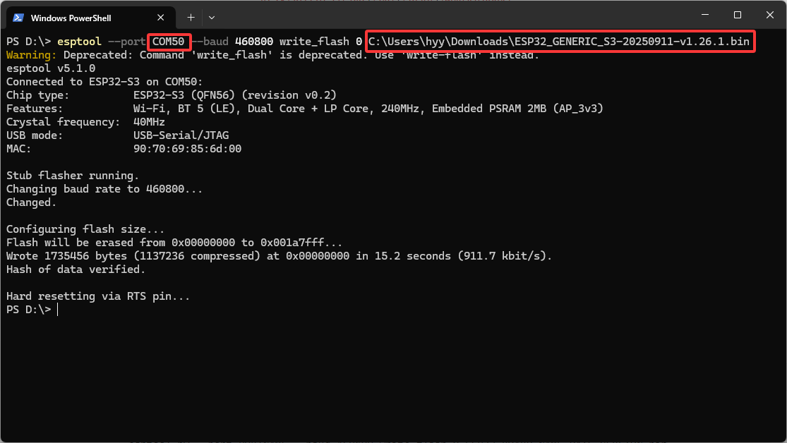 2.Erase the chip Flash. On Windows systems, run the following command.