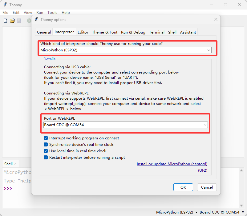 If this is the first time installing MicroPython on an ESP32 development board, you must use esptool to erase the chip’s Flash and then flash the MicroPython firmware. For esptool installation instructions, refer to the official Espressif documentation.