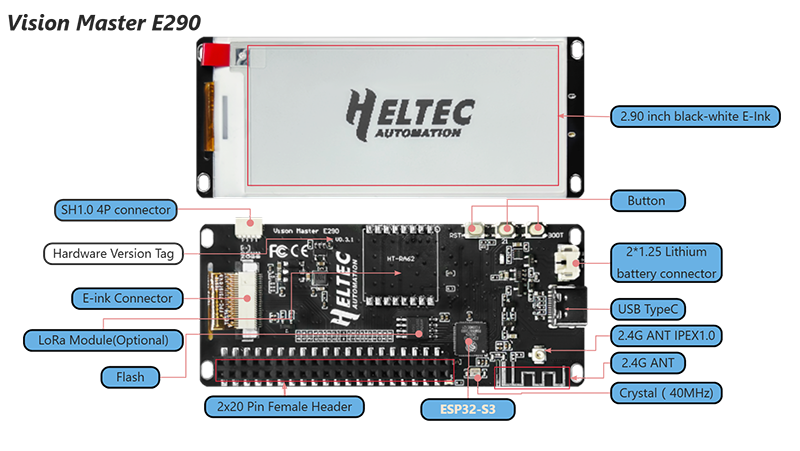 The Vision Master E290 (HT-VME290) is a 2.90-inch black-and-white E-Ink development kit with Bluetooth, Wi-Fi, and LoRa connectivity, supporting multiple frameworks for applications like electronic labels, identity tags, and open-source projects such as Meshtastic.
