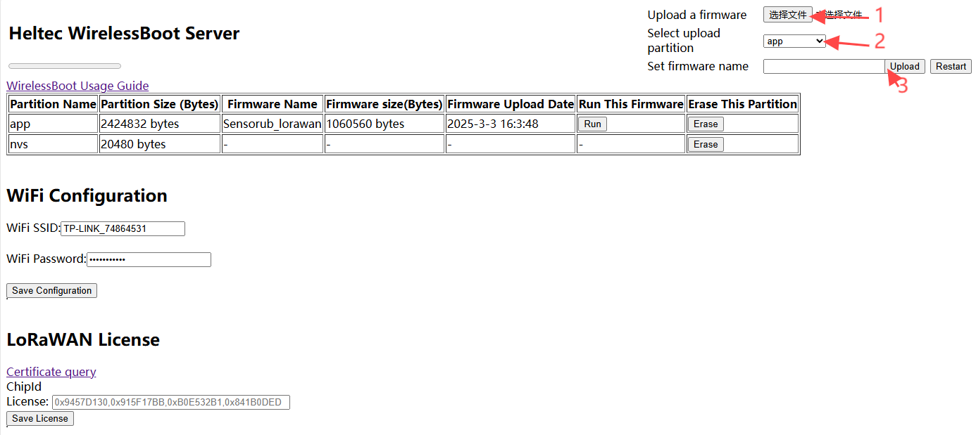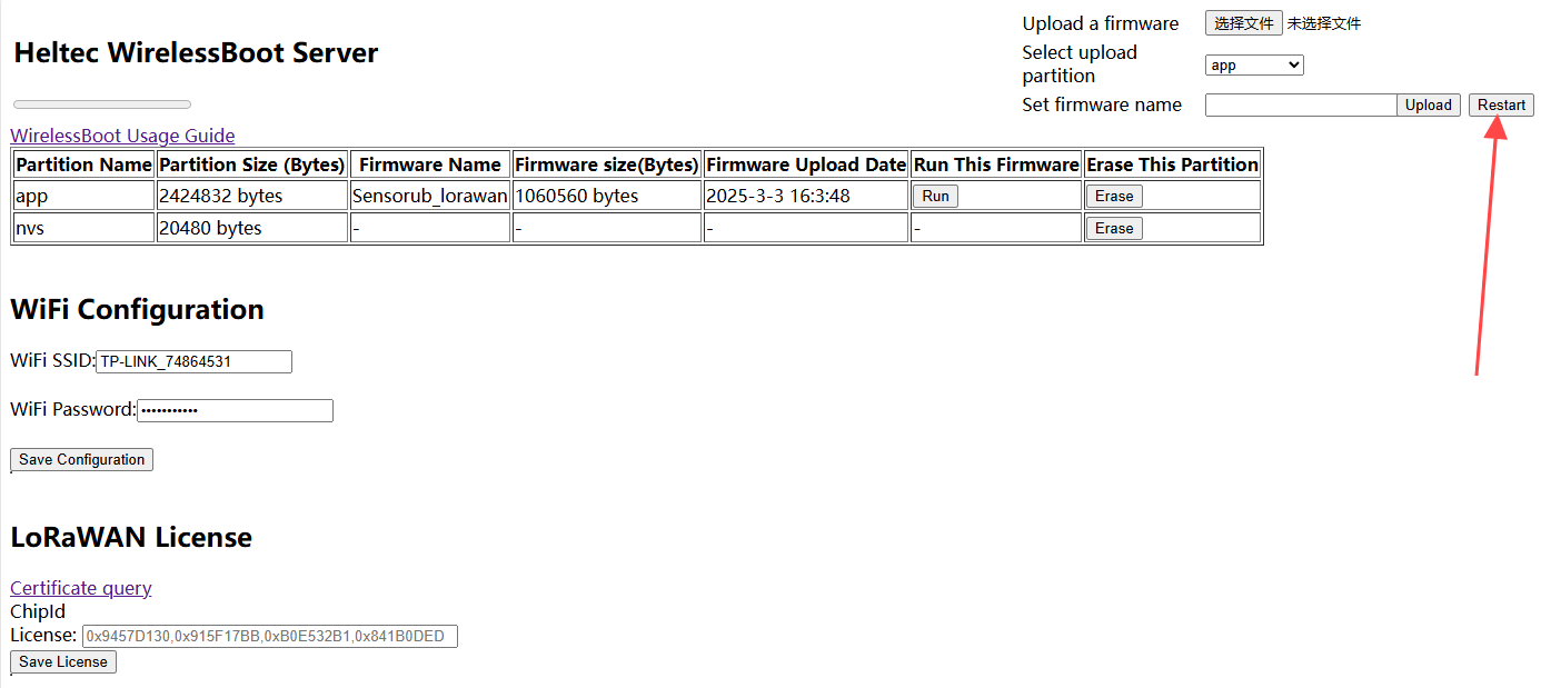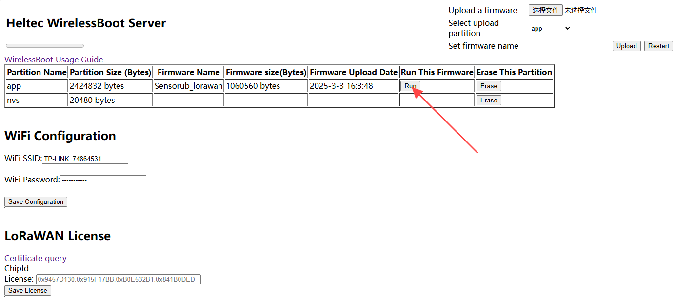 Navigate to the WirelessBoot page, choose the corresponding firmware,select an APP partition, and click "Upload."