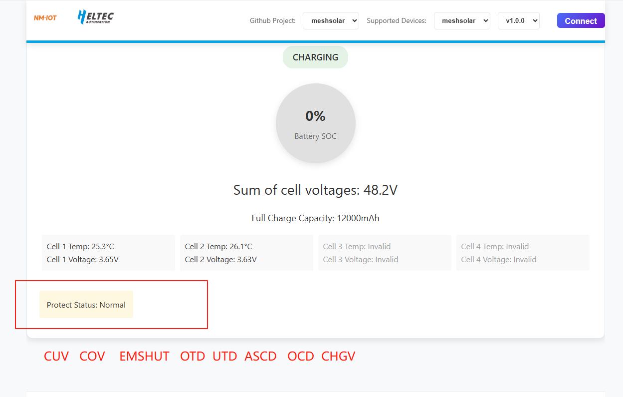 COV | Cell Over Voltage | Verify battery type matches MeshSolar type, check DIP switch/solder point configuration against web cell count settings. Reset after troubleshooting. |