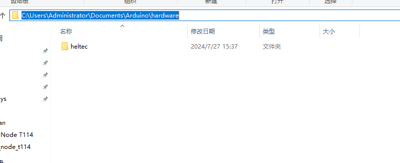 - Go to the "heltec" folder, refer to the figure below to confirm whether the path in the red box is correct. Unzip the compressed package you downloaded to this path.