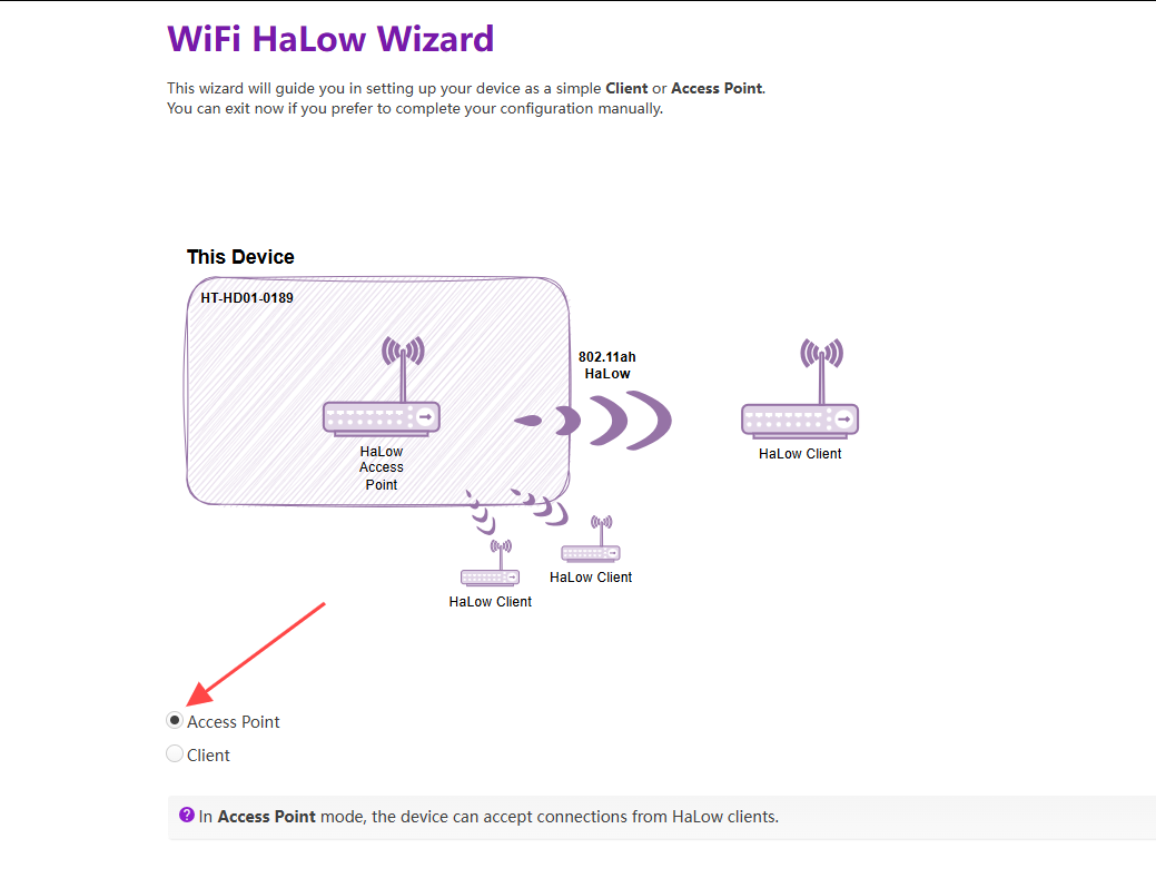 AP mode is a basic operating mode. In Access Point mode, the device can accept connections from HaLow clients.