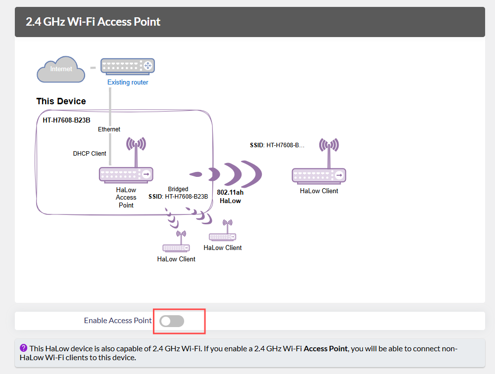 - Enable a 2.4 GHz Wi-Fi Access Point. While the AP provides a HaLow hotspot, it can also offer a standard 2.4G Wi-Fi hotspot. If power consumption is not a concern, we recommend enabling it to facilitate subsequent configuration and management.