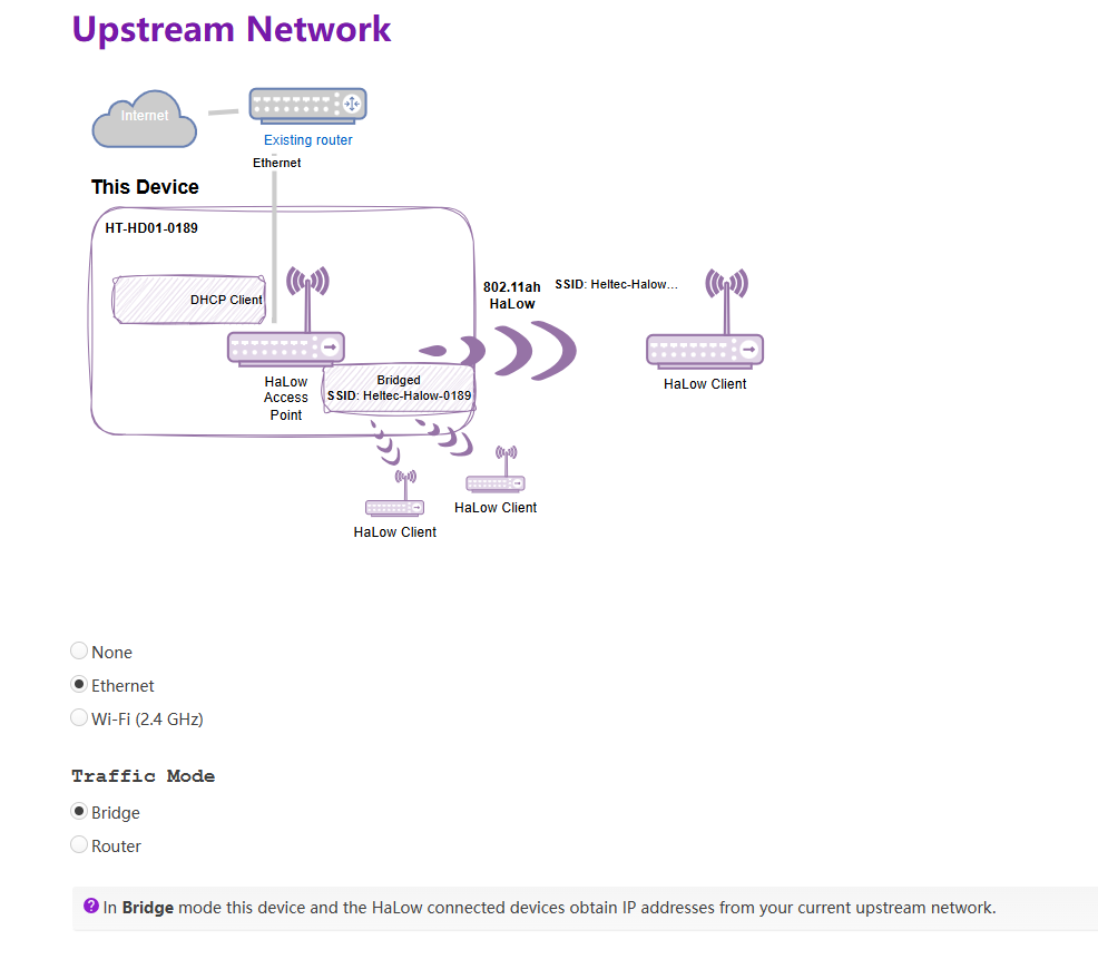 - Bridge: In Bridge mode this device and the HaLow connected devices obtain IP addresses from your current upstream network.