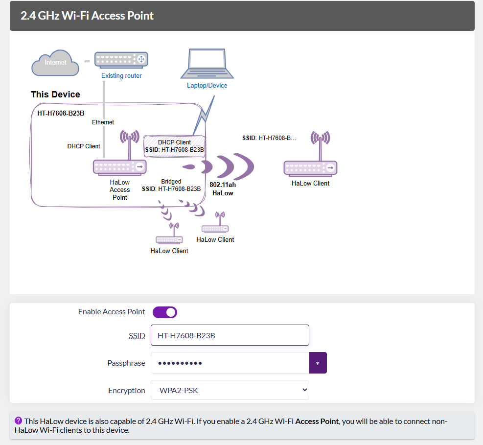 This HaLow device is also capable of 2.4 GHz Wi-Fi. If you enable a 2.4 GHz Wi-Fi Access Point, you will be able to connect non-HaLow Wi-Fi clients to this device.
