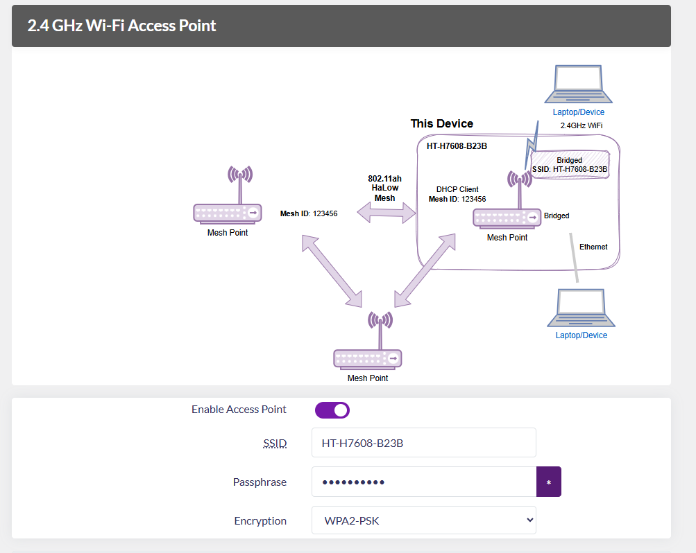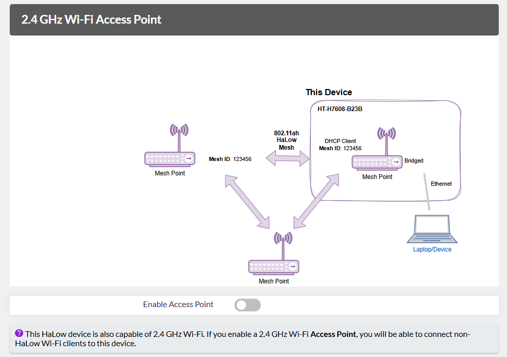 This HaLow device is also capable of 2.4 GHz Wi-Fi. If you enable a 2.4 GHz Wi-Fi Access Point, you will be able to connect non-HaLow Wi-Fi clients to this device.