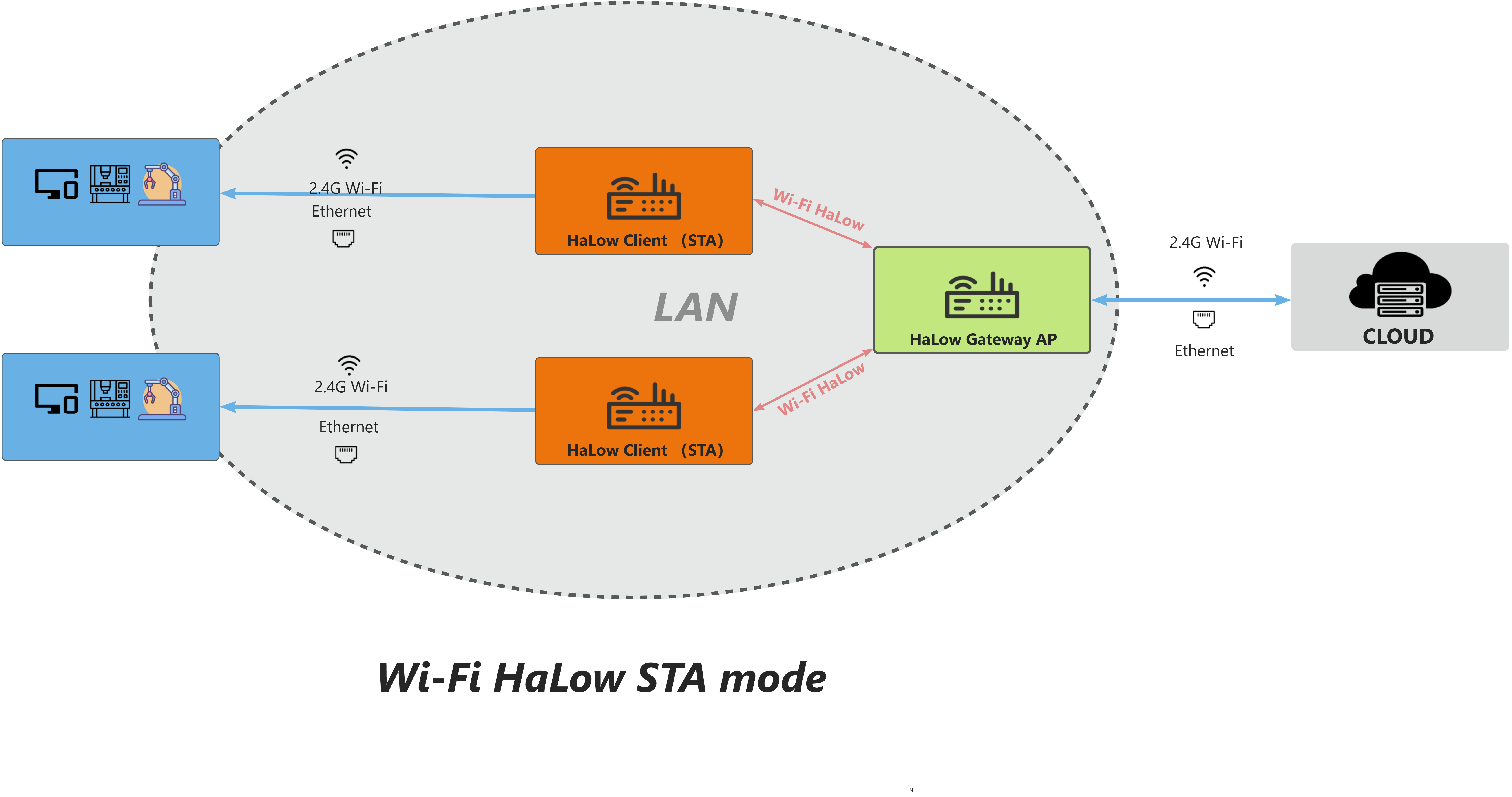 Extender | Non-HaLow devices obtain IPs from the DHCP server on this device and this device uses NAT to forward IP traffic |