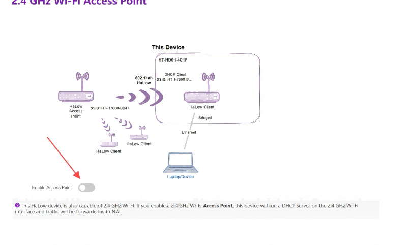 - This HaLow device is also capable of 2.4 GHz Wi-Fi. If you enable a 2.4 GHz Wi-Fi Access Point, you will be able to connect non-HaLow Wi-Fi clients to this device.