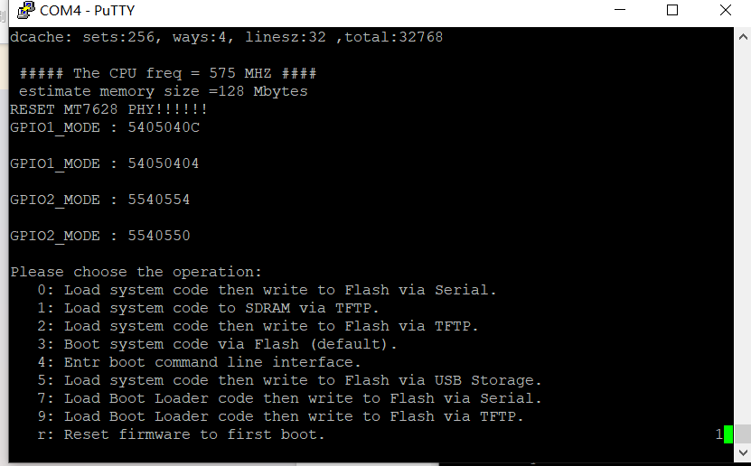 Power on the device. During startup, it will output the following log. Before the countdown finishes, select option 2 by pressing the number key “2” on the keyboard. If the message is missed, you can reset the device by pressing the RST button.
