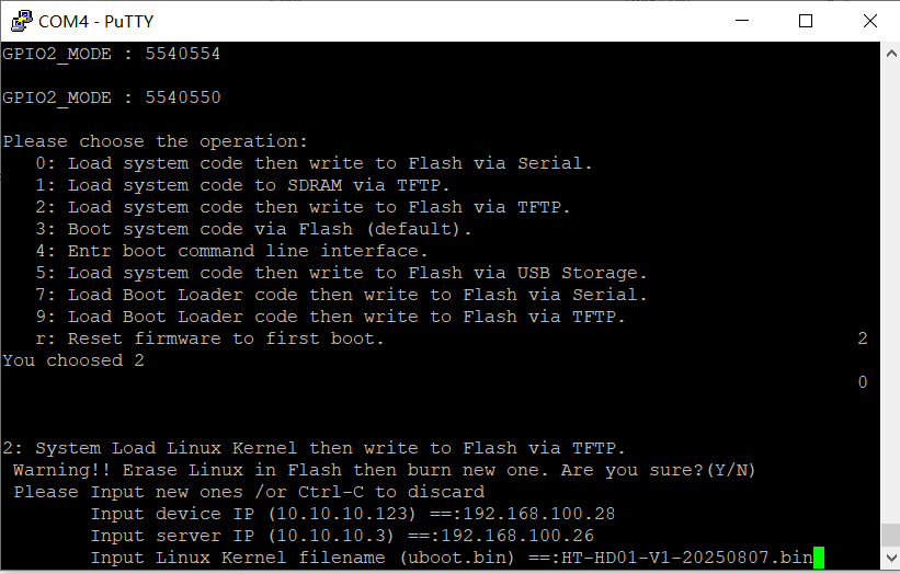 As shown in the figure below, enter the following items in sequence: the device IP (the device’s own IP; it can be any value as long as it is in the same subnet as the server IP, i.e., the PC’s IP), the server IP (the static IP configured on the PC), and the Linux Kernel filename (the firmware file to be flashed). Press Enter after each input. In other words: enter the device IP and press Enter → enter the server IP and press Enter → enter the Linux Kernel filename and press Enter.
