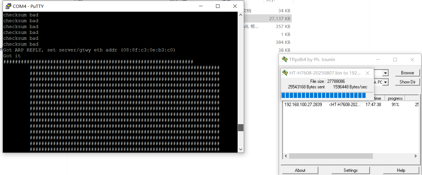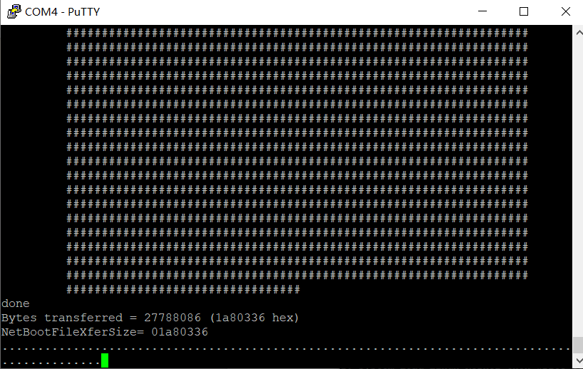 After the firmware upload is completed, the following interface will appear, indicating that the firmware is being written to the device. When the serial debugging tool displays normal log output and no longer prints “……………..”, the flashing process is complete. At this point, the Ethernet cable and USB-UART module can be disconnected.