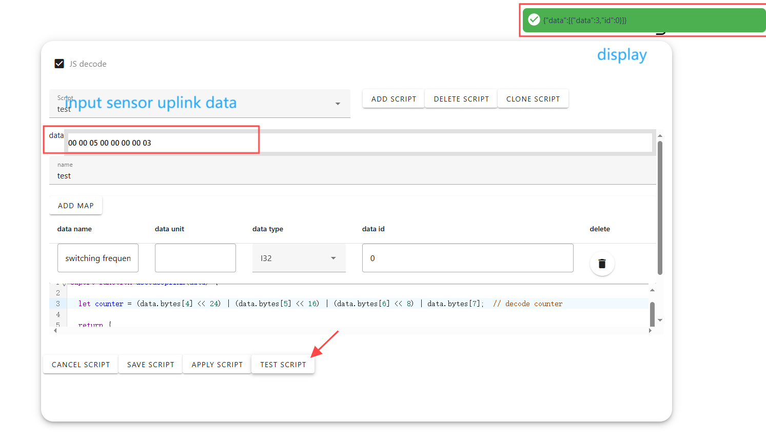 The decoding script only needs to define the decoding function. Note that it should be read based on the format of the upstream data packet returned, and the returned ID should be consistent with the above data ID. The code is as follows.