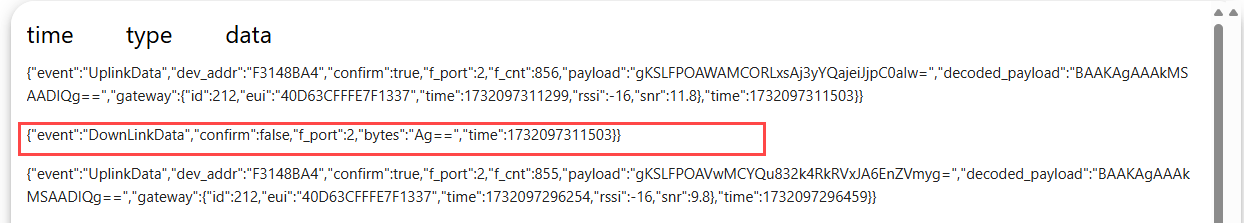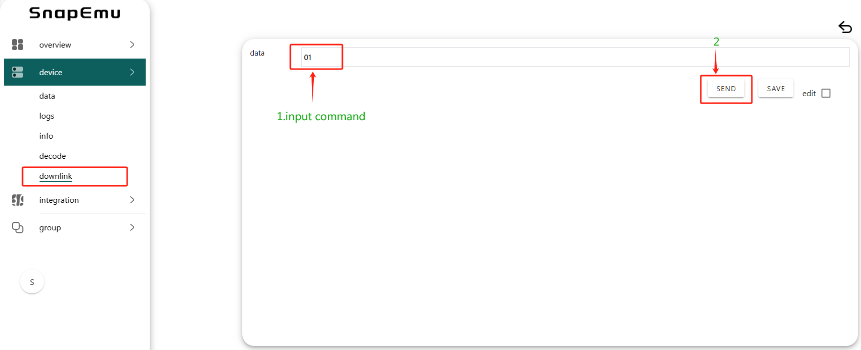 Users can send downlinkdata commands on snapemu, it converts commands into payloads suitable for the LoRaWAN protocol format and sends them to the LoRaWAN gateway through the network. The gateway receives the snapemu's commands and sends them to the device via LoRa wireless signals. The device receives commands, parses them, and executes tasks.