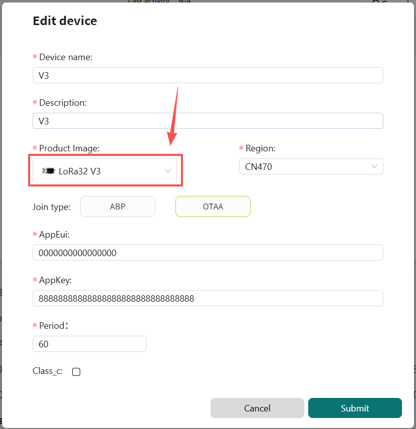 After running the lorawan code, the device will be automatically activated, and if everything goes smoothly, it will be as shown in the figure. Then click here to select the corresponding product image.